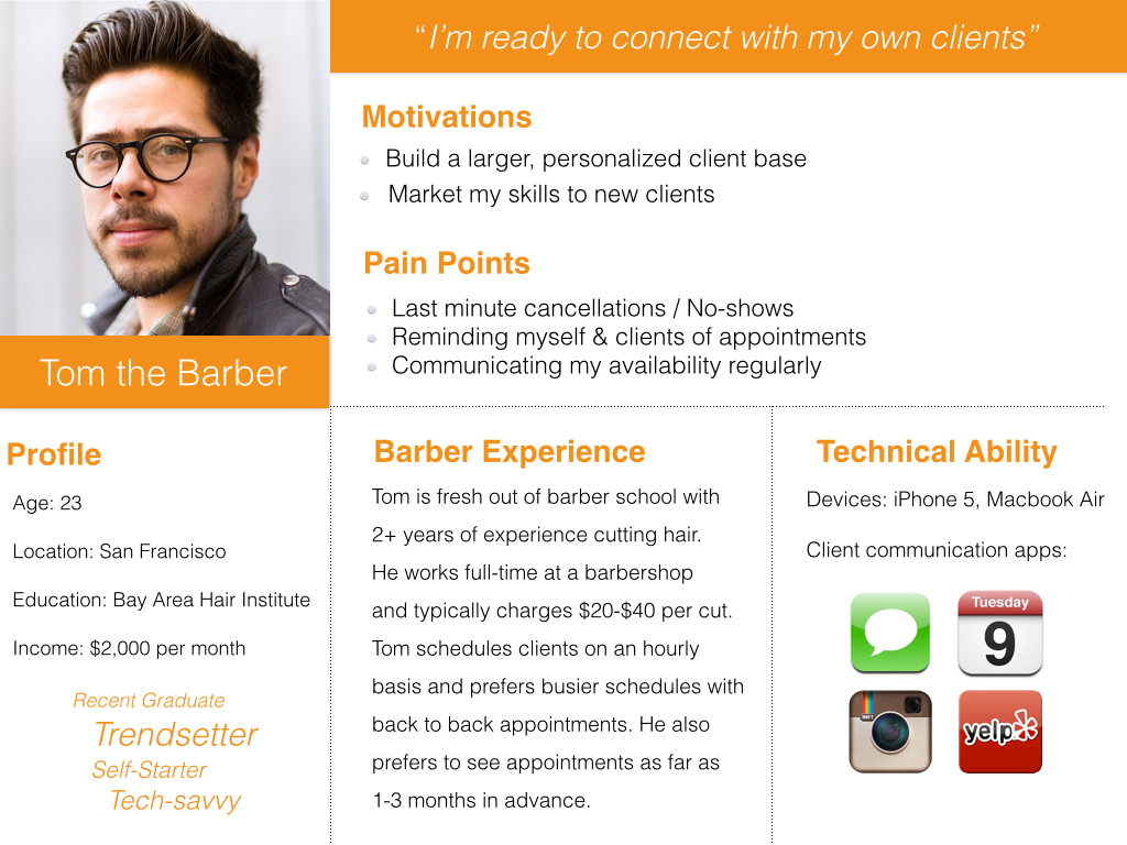 Created an online survey distributed to 10+ independent barbers in San Francisco to find out the following about our target audience: